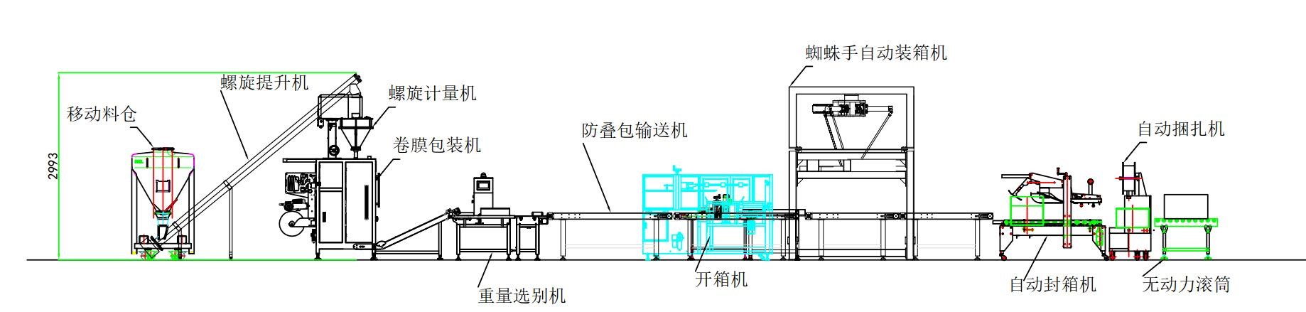 整條消毒粉包裝機流水線由移動料倉-提升機-包裝-重量選別機—開箱機-裝箱機-封箱機-捆扎機。