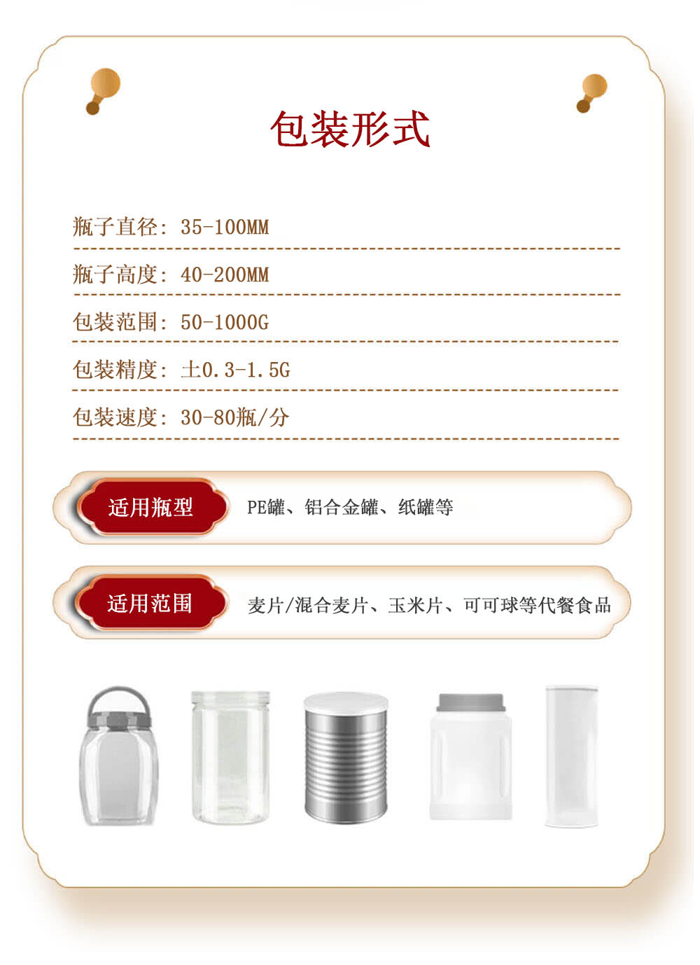 1、適用于各種PE罐、鋁合金罐 、紙罐等各種圓形規格以及特殊定制模具瓶型使用,針對流通性良好的麥片自動定量灌裝生產。